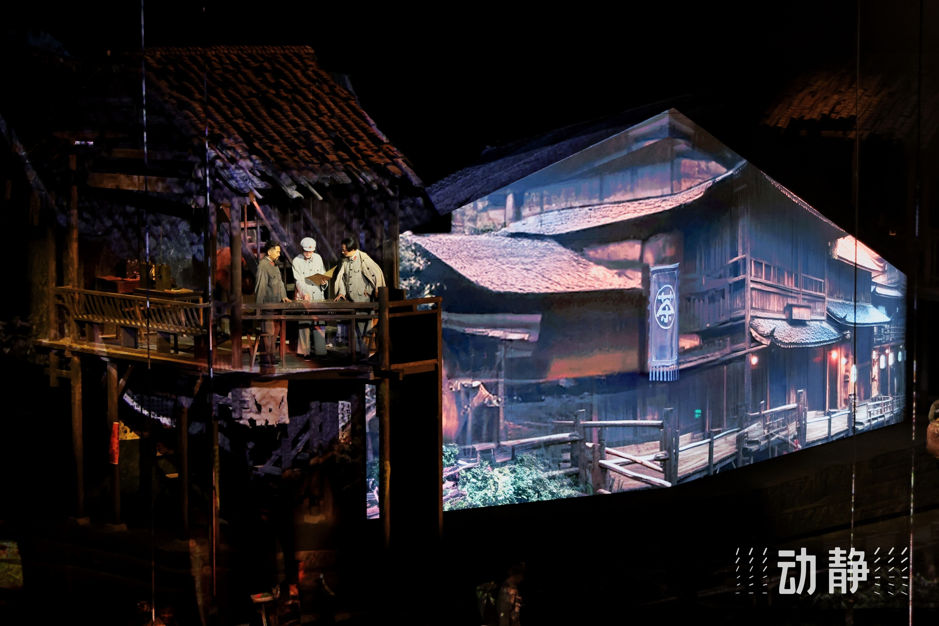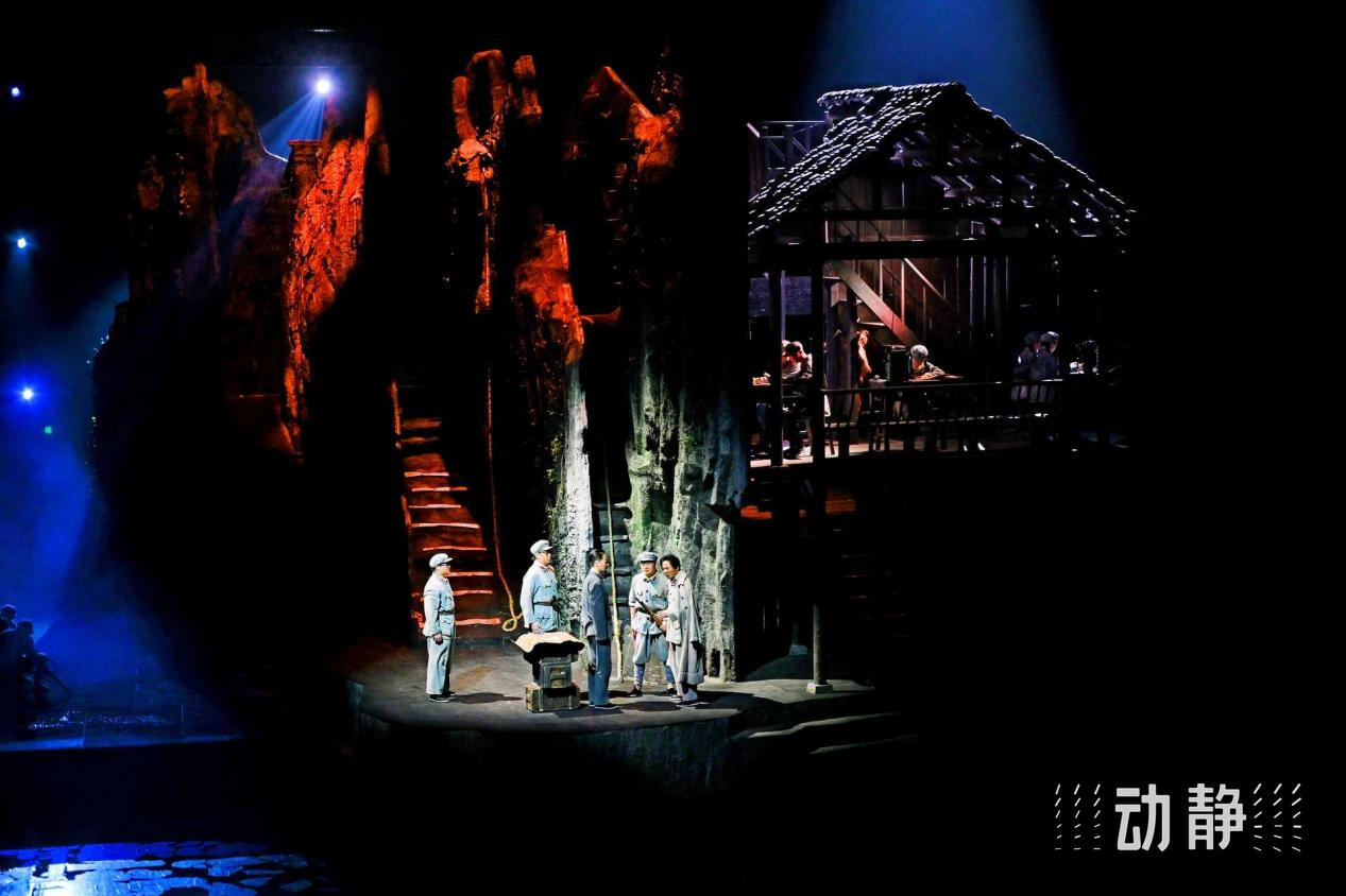 9400平方米定制舞台、800吨水循环成河、26米落差瀑布,8D音效声声环绕、360°旋转舞台……声、光、水、电、影、景融合,以一台剧,再现红色革命史诗,让观众可以跨越时空,“对话”1935。