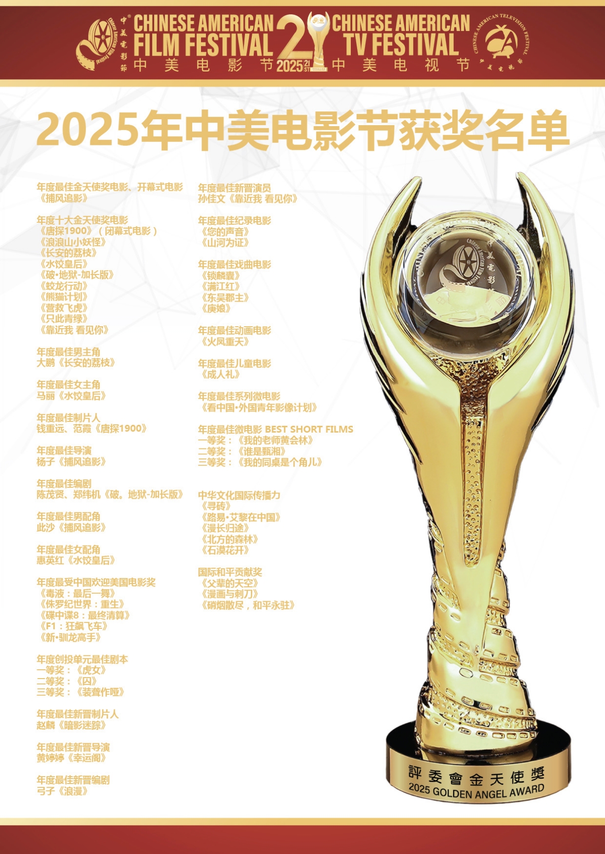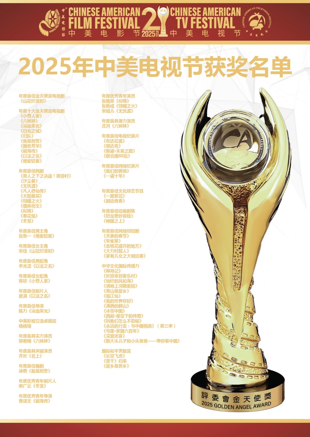美国时间11月6日,2025年第二十一届中美电影节|中美电视节开幕式暨“金天使”奖颁奖典礼在美国洛杉矶举行。由贵州省委宣传部推出的5部影视剧斩获多项大奖,系近年来在中美电影、电视节获奖最多的一次,实现历史性突破。